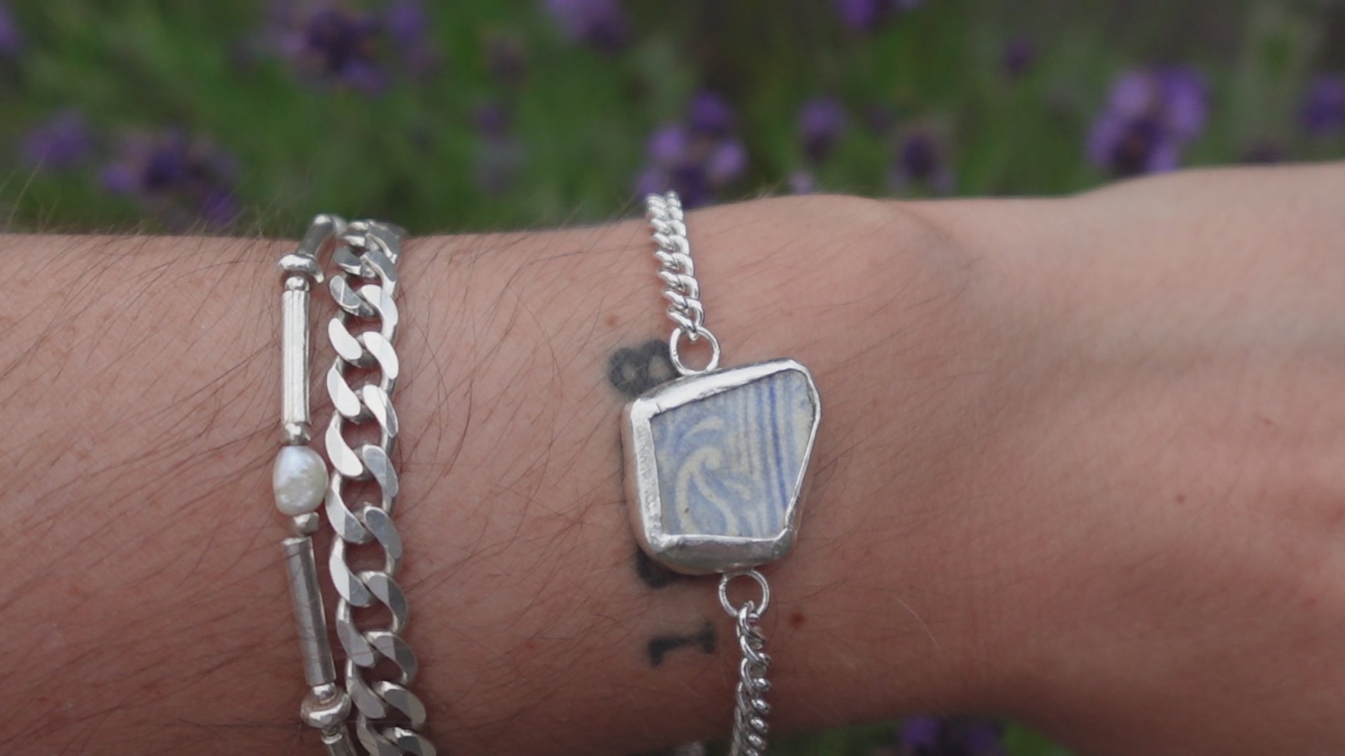 A fragment of coastal history, the Devon Shores Bracelet showcases a piece of wave-patterned pottery discovered along the shores of Devon. Framed in hand-forged sterling silver and set on a delicate loose curb chain, this one-of-a-kind piece tells a story of tides and time. Lightweight and comfortable, it’s perfect for everyday wear or layering with other treasures.