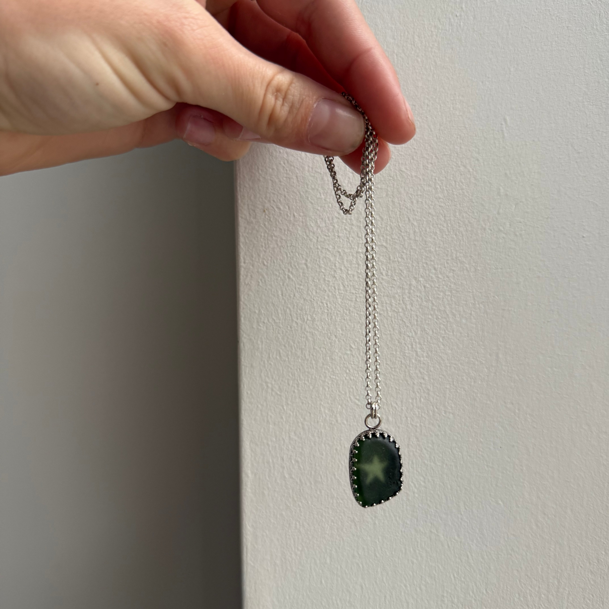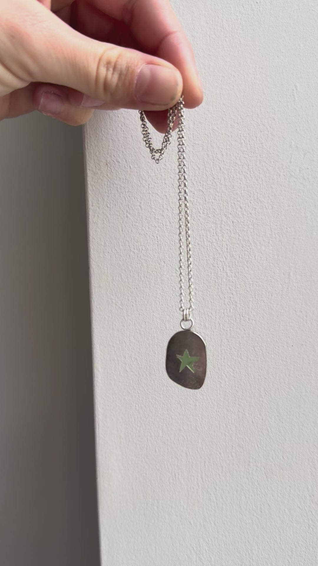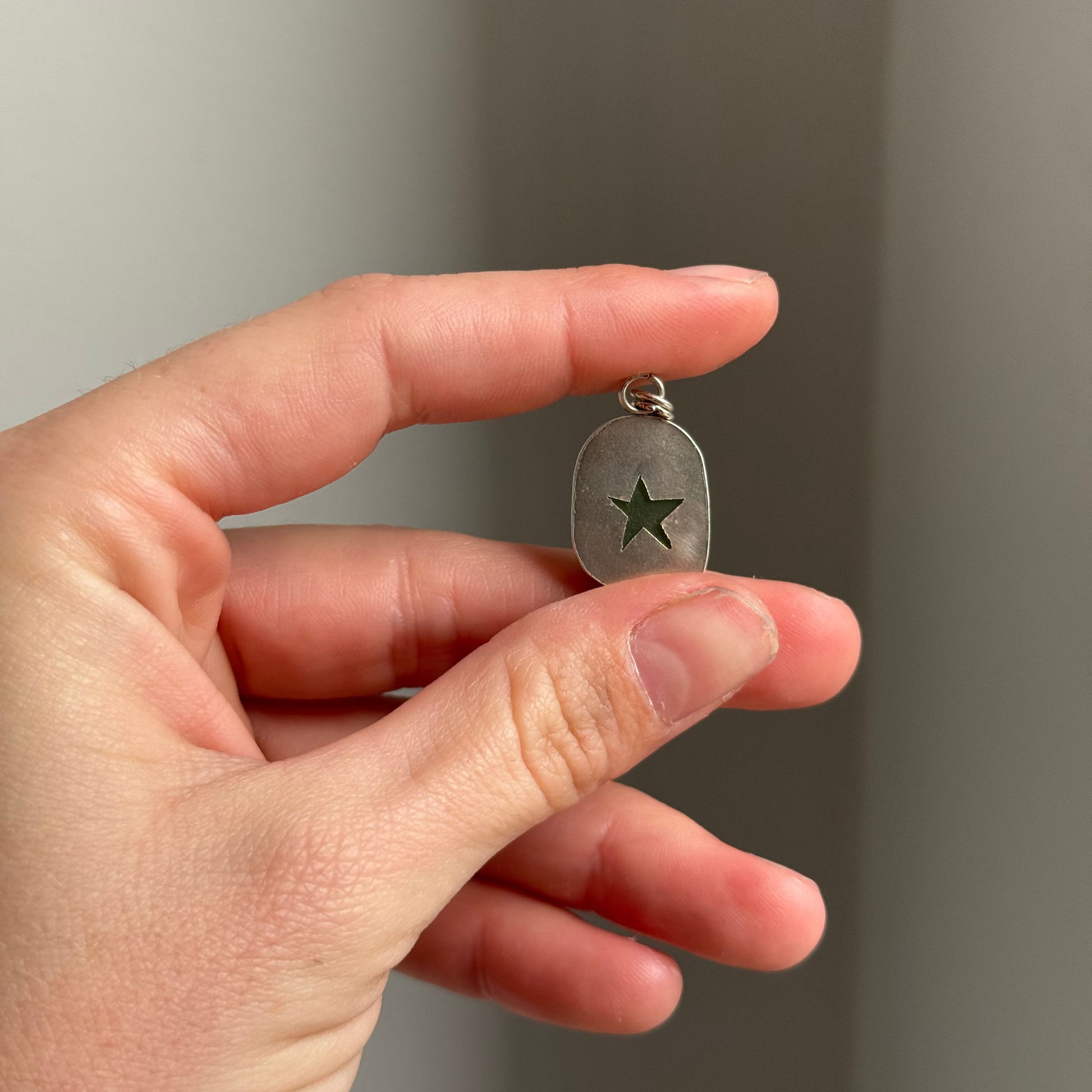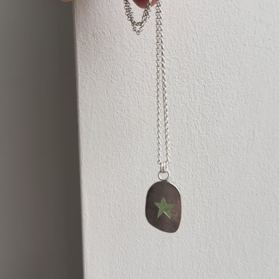 Minimal and meaningful, the Penzance Star Pendant features a deep green piece of sea glass with a hand-cut star at the back, allowing the light to shine through. Found along the Cornish coast and set in hand-forged sterling silver, it celebrates Penzance - the place where I first learned to silversmith. A wearable piece of my story and a guiding light for yours.