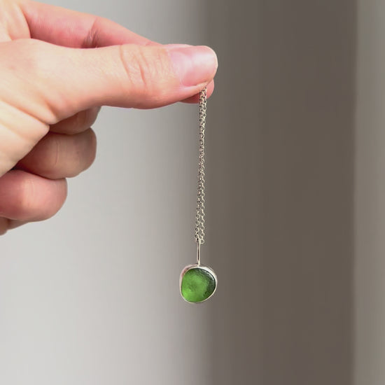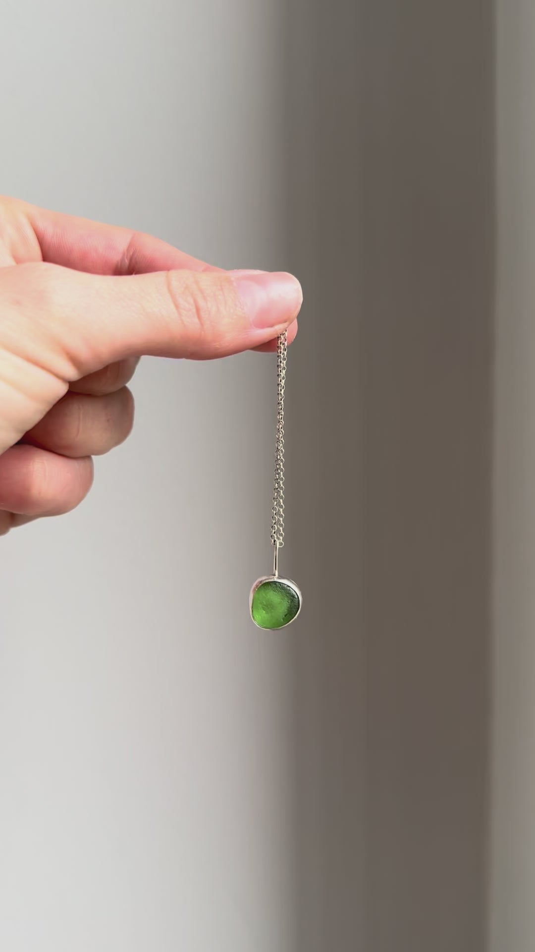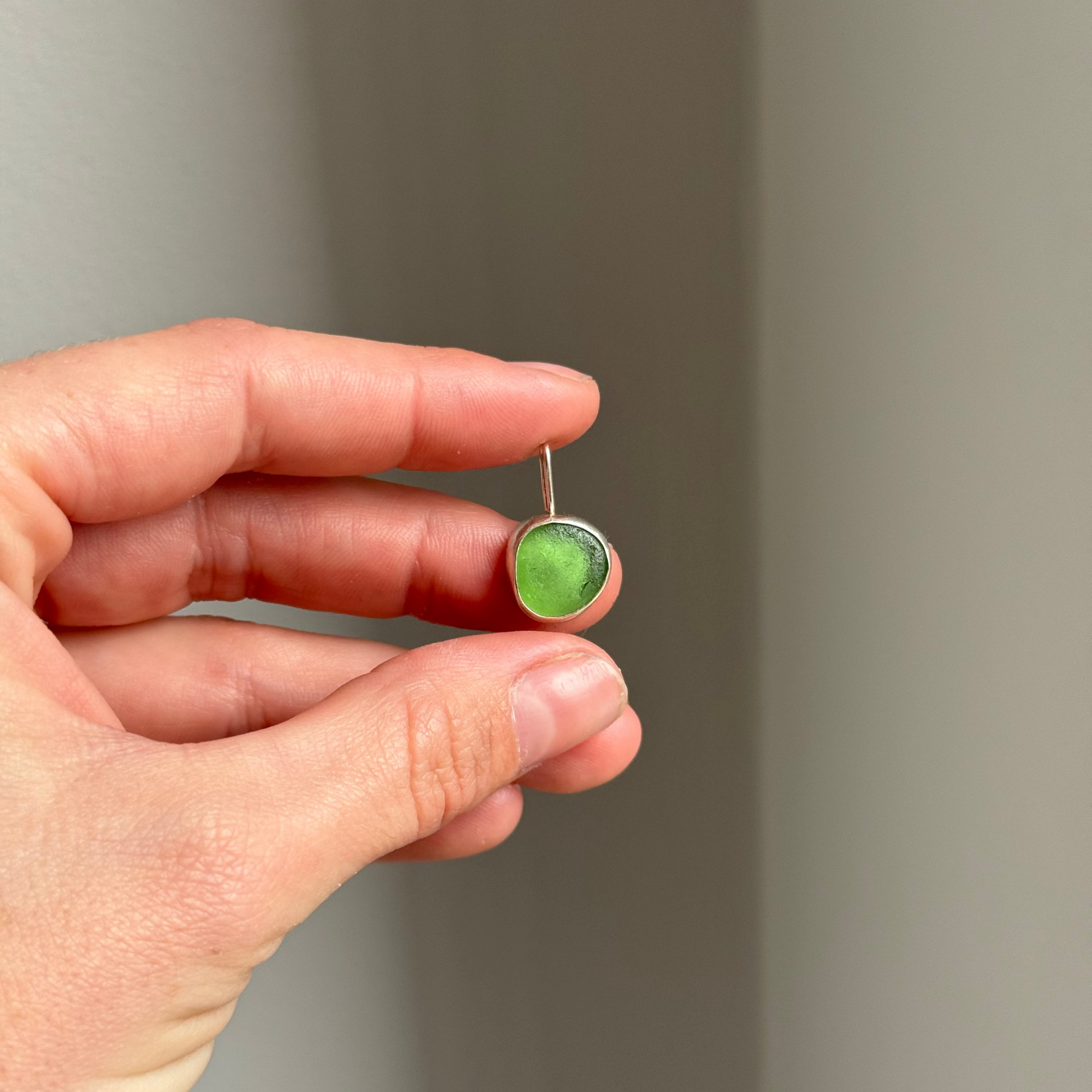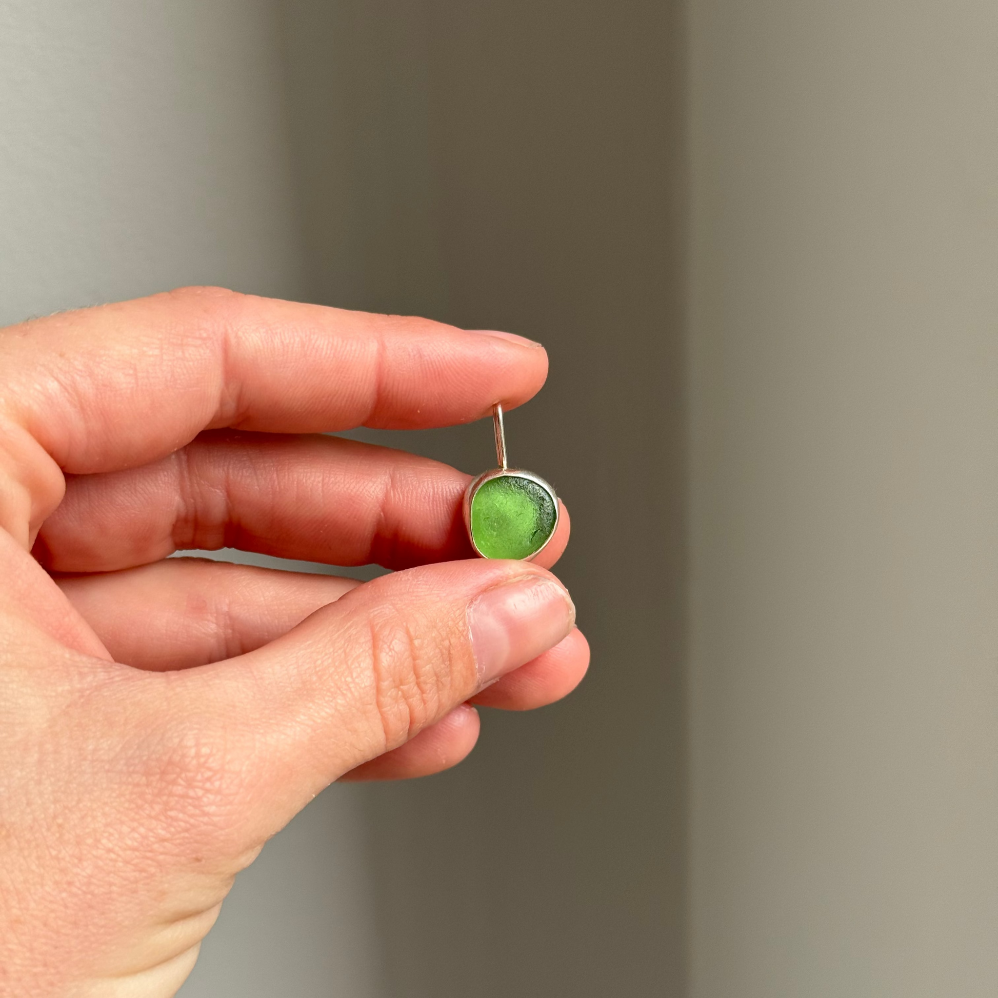Polzeath is full of light and energy - surfers on the waves, sunshine over the bay. This bright green circular pendant reflects that glow, a lively tide-shaped fragment framed in sterling silver.