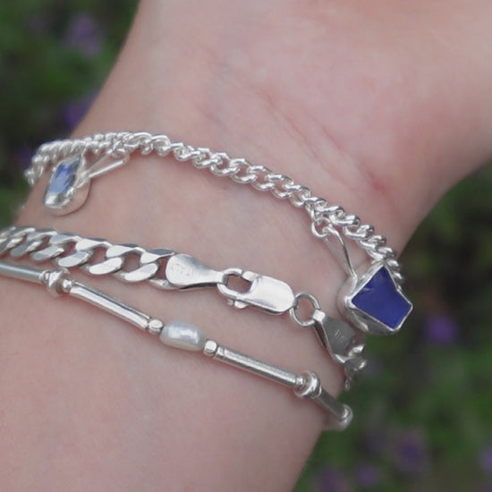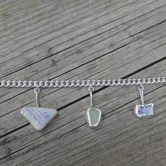 Playful and full of coastal character, the Shore Finds Bracelet features an array of tiny sea glass and pottery shards, each hand-set in sterling silver and suspended from a delicate loose curb chain. Every charm is unique, capturing the colours and textures of the shoreline in miniature. Lightweight and effortless, it’s perfect worn solo or layered for a bold, beachy look.